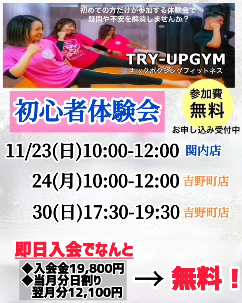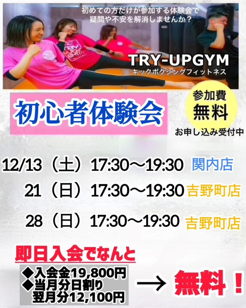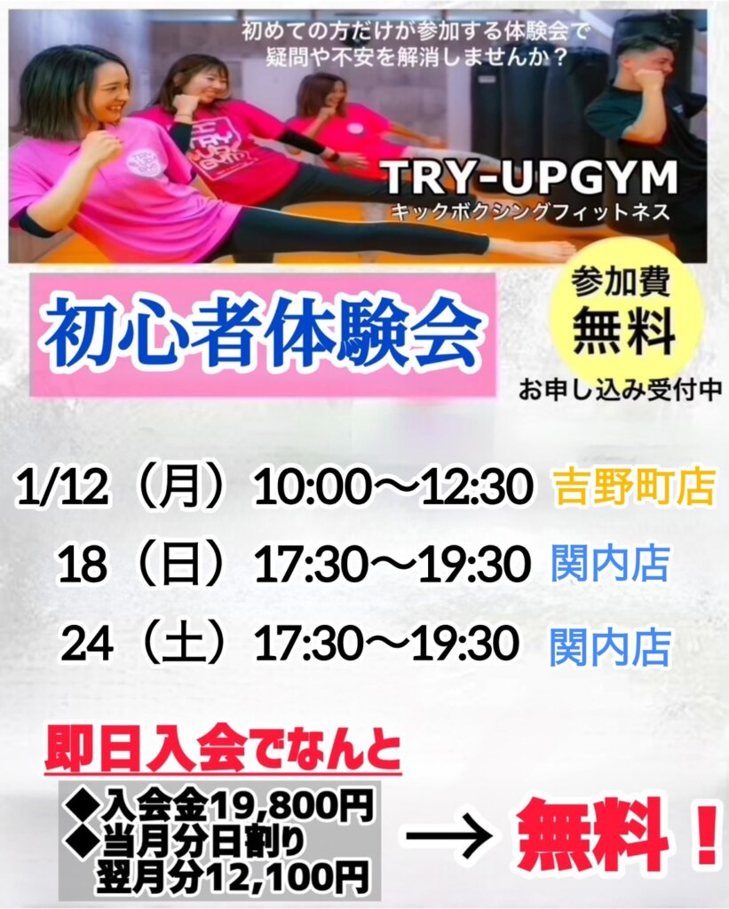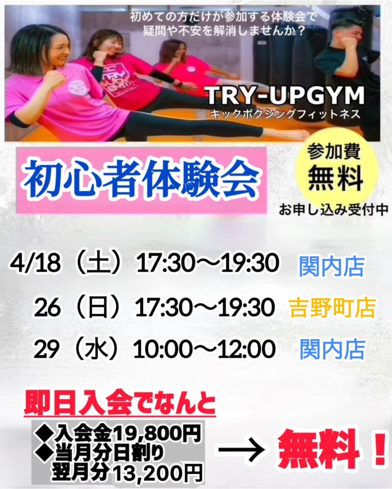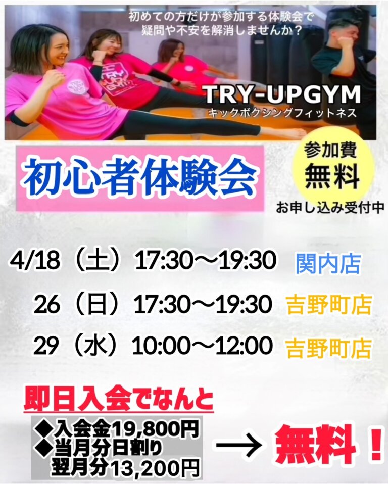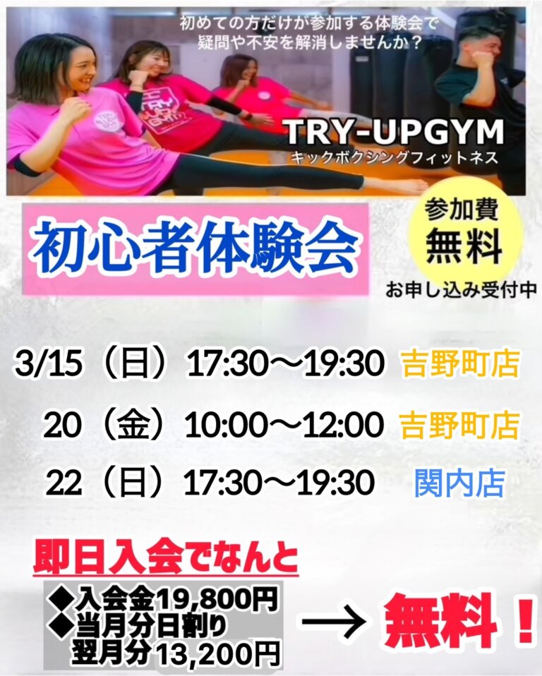 まほ2024-07-18Trustindex は、レビューの元のソースが Google であることを確認します。 デスクワークの為肩こりが酷く肩凝り解消の為、身体を動かそうと思い通い始めたのですが、始めてからひどい肩こりも良くなり体も引き締まったと言われるようになり効果を感じています。キックボクシング効果凄いです(笑)スタッフの方も皆さん素敵な方なのでリフレッシュになります。これからも定期的に通わせていただきます! たるが2024-07-15Trustindex は、レビューの元のソースが Google であることを確認します。 インスタで『トライアップジム』を知ってずっと気になっていたので体験に来てみました! 行くまでは不安でしたがいざ始まってみたらレッスンが楽しくとても魅力的です! 教え方も丁寧で初心者の私でも安心して出来ました! 通われてる会員さんも皆んな親切で楽しく通えそうなので体験日に即決で入会させて頂きました!頑張って通って身体を引き締めたいと思います(^^) D2024-07-12Trustindex は、レビューの元のソースが Google であることを確認します。 今まで他のフィットネスジムにも通っていましたが、筋トレだけだし1人でやる事に飽きてしまい全然続かず辞めてしまいました、、、。 こちらのトライアップジムでは、皆んなでトレーナーがレベルに合わせてレッスンを行ってくれるのでジムに来てしまえば頑張れます! 今では週に2.3回の運動習慣がつき、3キロのダイエットにも成功。 トライアップは1人で運動が続かない方におすすめです!!始めて良かったと思います! 橋本拓哉2024-07-12Trustindex は、レビューの元のソースが Google であることを確認します。 始めようと思ったきっかけはダイエット。運動習慣をつけたいなと思い始めました。 トライアップジムを選んだ理由としてはインスタで見て楽しそうだなと思ったのがきっかけで、実際に体験したところ楽しくて即日入会しました。 ジムの雰囲気はとてもよく会員同士の挨拶がすごく良い。 トレーニングはレベル別にレッスンが分かれててやりやすい。 トレーナーさんは丁寧で色々とアドバイスをくれます。 ジム内は綺麗です。 システムについては自分の都合のいい日に予約無しで来ることが出来てとてもいいです。 男女別ロッカーやシャワーがあり仕事帰りにも来やすいです。 これからもお世話になります。 m2024-07-11Trustindex は、レビューの元のソースが Google であることを確認します。 初めてキックボクシングに挑戦しましたが、トライアップジムのインストラクターは指導が丁寧で優しく、毎回とても楽しく通えてます! 週に2回のペースで通い始めて1ヶ月が経ちましたが、体重が3キロ減り、体力もかなりついてきました。ジム内はいつも清潔で、快適にトレーニングできます。 また駅から近く、夜まで営業しているので、仕事帰りにも通いやすいです。全体的にとても満足しています。 友人にもぜひ勧めたいと思います! 柳川直人2024-07-08Trustindex は、レビューの元のソースが Google であることを確認します。 運動不足で楽しく運動習慣をつけたいと思い、「吉野町 キックボクシング」で検索したところこちらのトライアップジムの口コミが良かったので体験会に来てみました! 今まで他のフィットネスジムにも通っていましたが、1人でやるので飽きてしまい全然続かず…。 トライアップジムではレッスン式でインストラクターによってメニューが変わるので飽きずに、楽しく通えてます! インストラクターも会員さんも良い人ばかりで居心地が良いです! 1人でトレーニング出来ない人は一度体験に来てみても良いと思います! 頑張って痩せます笑 これからも宜しくお願いします! m2024-06-25Trustindex は、レビューの元のソースが Google であることを確認します。 「運動不足を解消したい!痩せたい!ストレス発散したい!」と思いジムを探していたところ、こちらのトライアップジムが出てきて体験を申し込み、ここなら続けられそうと思い入会しました! 入会してまだ3ヶ月ですがとても満足しています! トレーナーさんたちの人柄がとても良く、レッスンも楽しくまた行きたいと思わせてくれます! 他の会員さんも皆んな良い人で雰囲気がめちゃくちゃ気に入ってます! 頑張って痩せたいと思います(笑)これからも宜しくお願いします(^^) 高橋遥2024-06-22Trustindex は、レビューの元のソースが Google であることを確認します。 社会人になり身体を動かす機会がなくなり、ずっと運動不足を解消したく悩んでいたところトライアップジムをネットで見つけ興味を持ち体験にいきました! 1人では続かないし、通えるか凄く不安でした。 こちらのトライアップジムを体験し、インストラクターが凄く優しく、盛り上げ上手でここなら楽しく継続できそうと思い即日入会しました! 今では週に3.4の運動習慣がつき、体重も5キロ減り職場の皆んなにも痩せたねと言ってもらえることが増え、本当に入会して良かったと思います! これからも宜しくお願い致します! 渡辺大輔2024-06-13Trustindex は、レビ